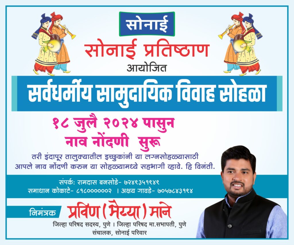 इंदापूर तालुक्यामध्ये सोनाई प्रतिष्ठानच्या माध्यमातून लवकरच सर्व धर्म हे सामुदायिक विवाह सोहळा आयोजित करण्यात आलेला आहे सोने प्रतिष्ठानचे संचालक प्रवीण माने यांनी आज पत्रकार परिषद घेऊन ही माहिती दिलेली आहे